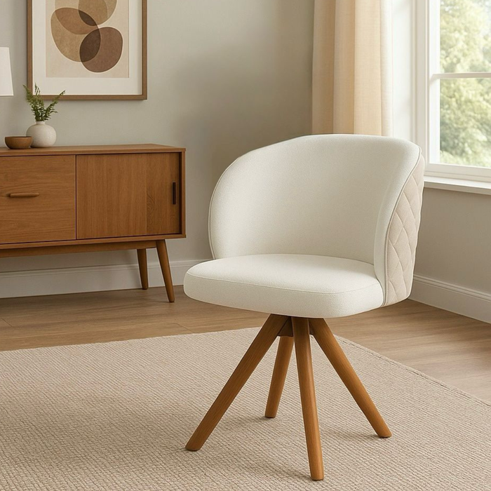 O revestimento em tecido bouclé branco — um dos tecidos mais desejados do décor contemporâneo — oferece textura suave e um visual acolhedor. A base giratória em madeira maciça castanho garante resistência, estabilidade e um toque natural que valoriza o mobiliário como peça de destaque.