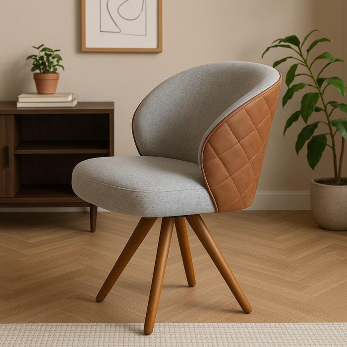 O revestimento composê em linho cinza com courino durango kaki — um dos tecidos mais desejados do décor contemporâneo — oferece textura suave e um visual acolhedor. A base giratória em madeira maciça mel garante resistência, estabilidade e um toque natural que valoriza o mobiliário como peça de destaque.