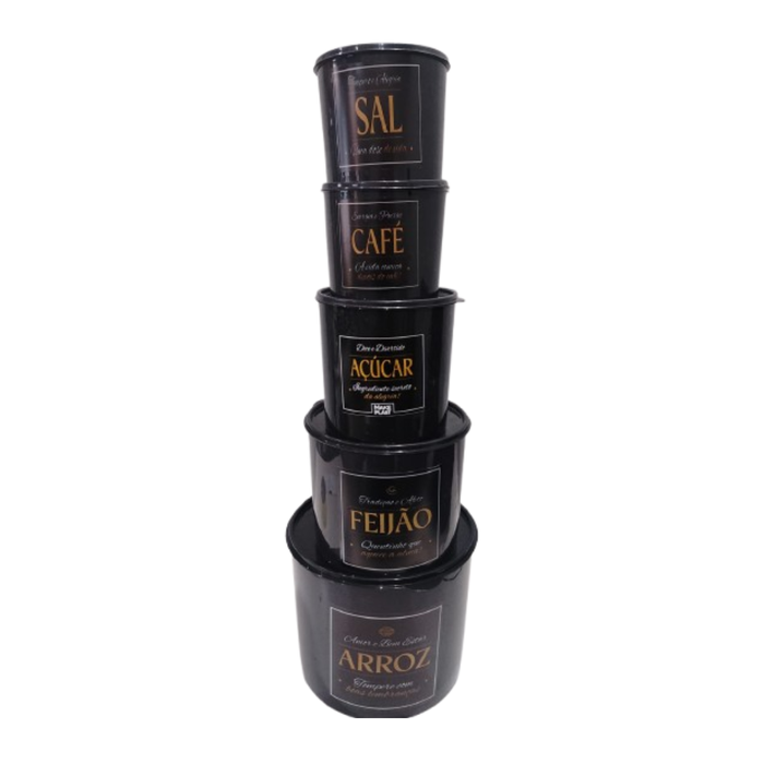 Organize sua cozinha com praticidade e estilo! O Kit de Potes de Mantimentos 5 Peças é perfeito para armazenar os itens essenciais do seu dia a dia: arroz, feijão, açúcar, sal e café. Cada pote é identificado e ideal para conservar os alimentos com mais higiene e durabilidade.