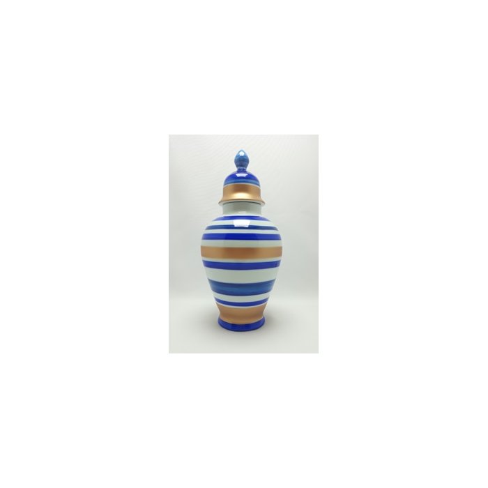 Potiche decorativo em porcelana todo pintado à mão, nas cores azul e bronze.