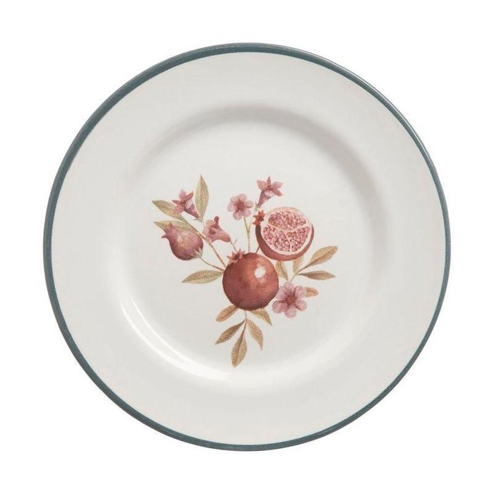 O Prato de Sobremesa Romã com 21 cm de diâmetro é produzido em cerâmica. Sua estampa apresenta romãs aquareladas à mão com aplicação digital, conferindo um toque artístico e sofisticado. Possui filete verde na beirada da aba. O prato pode ser combinado com diferentes outras linhas.