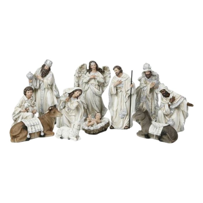Presépio Natalino com 11 Peças em Resina ? 20cm | Acabamento Branco com Detalhes Prateados