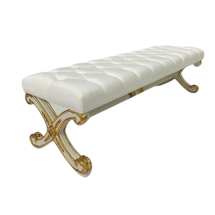 Fabricado em madeira maciça de Jequitibá Rosa, reconhecida por sua resistência e durabilidade, recebe um acabamento em laca branca com detalhes folheados a ouro, realçando sua imponência e exclusividade. Seu estofamento em veludo branco capitonê proporciona um toque de sofisticação e aconchego, elevando a experiência de conforto ao mais alto nível.