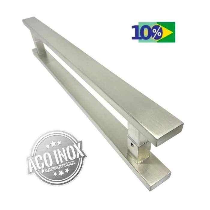 Puxador Plano duplo para porta.Descrição Técnica:Material: Aço Inox 304Medidas disponíveis: 40cm, 60cm, 80cm, 1 metro e 1,20 mt, 1,50 me e 1,80mtAcabamento: aço inox EscovadoMedida do perfil : 40mm largura x 10mm alturaFormato dos pé: quadradoAltura dos pés: 40mmMedida dos pés:25mm*Acompanha chave allen e parafusos para fixação.*Acompanha manual de instação contendo todas as informações necessárias.*Puxador adequado para vários tipos de portas: comum de madeira, vidro temperado, esquadrias de alumínio e aço.*Resistente a luz solar e a água.*Puxador duplo, ou seja, vendidos para os dois lados da porta (PAR).
