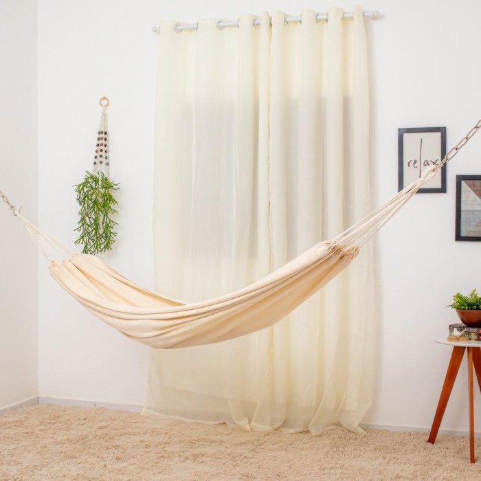 Uma rede de dormir simples e pequena na cor bege para quem procura descanso e lazer ao menor custo, com a garantia de um produto de qualidade. É leve, fácil de transportar, lavar e guardar.