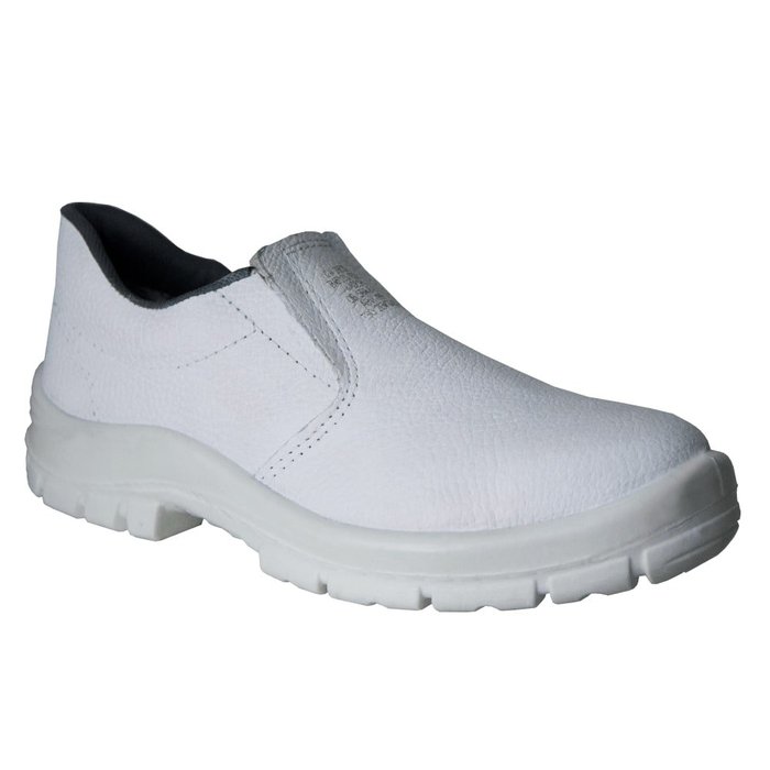 Calçado ocupacional tipo sapato, confeccionado em couro curtido ao cromo na cor branca, fechamento em elástico, palmilha de montagem em não tecido fixada pelo sistema strobel, solado de poliuretano monodensidade, sem bico, resistente ao escorregamento, resistente ao óleo combustível e absorção de energia na área do salto.