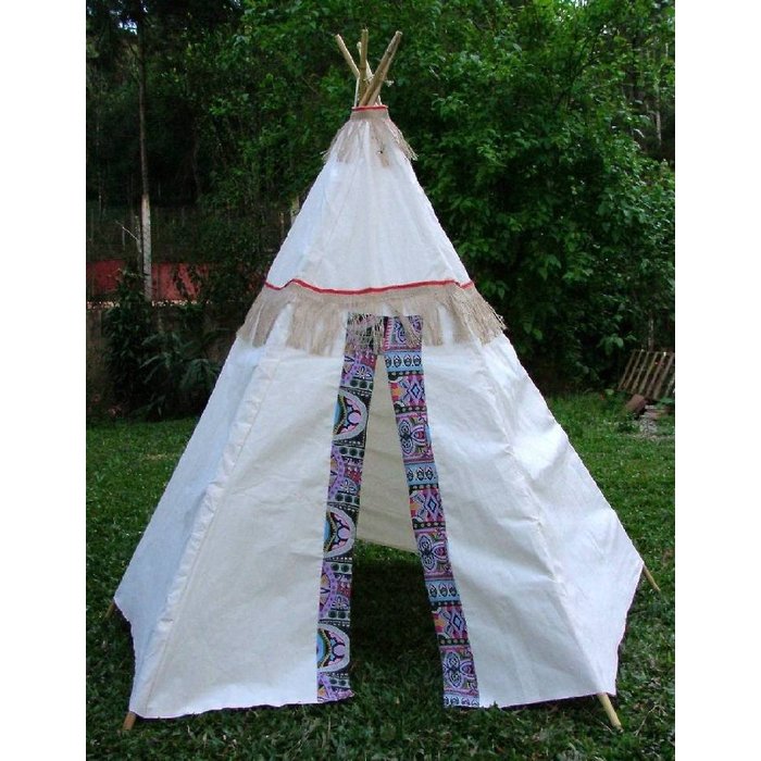 Uma tenda de índio confeccionada com tecido de algodão cru, com acabamento de algodão estampado e franjas, e estrutura de bambu. Essa cabana de índio acomoda facilmente de 3 a 4 crianças ao mesmo tempo.
