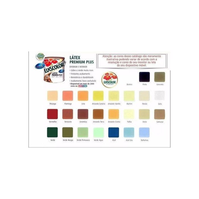 Com o LÁTEX PREMIUM PLUS LUKSCOLOR você protege e decora superfícies externas e internas, em geral. Proporciona um fino acabamento fosco aveludado que valoriza ainda mais seus ambientes. Com Suave Perfume, proporciona conforto e bem-estar, permitindo a sua permanência no ambiente do início ao fim da pintura. É um produto com alto poder de cobertura e rendimento, apresentando durabilidade e resistência às ações do tempo e a fungos (mofo), excedendo em todos esses quesitos, as normas estabelecidas para a categoria Premium pelo Programa Setorial de Qualidade para Tintas Imobiliárias (PSQ-TI).DicaDurante 15 dias após a aplicação, não submeta a superfície pintada a esforços; Caso apareçam manchas causadas por respingos de água, pingos isolados de chuva e/ou condensação de vapor d água na pintura, até um período de 15 dias após a aplicação da tinta, recomendamos que você lave prontamente a superfície com água, sem esfregar; Durante o procedimento de limpeza, não esfregue a superfície, pois poderá ocasionar manchas esbranquiçadas. Limpe suavemente com pano ou esponja macia com água e detergente neutro. Em seguida limpe com pano umedecido; Para obter os melhores resultados, utilize sempre os produtos LUKSCOLOR, desde a preparação das superfícies até o acabamento final.A percepção da cor do produto aplicado poderá apresentar variações em função da luminosidade do ambiente, brilho e textura do produto e interferência da presença de outras cores no mesmo ambiente.