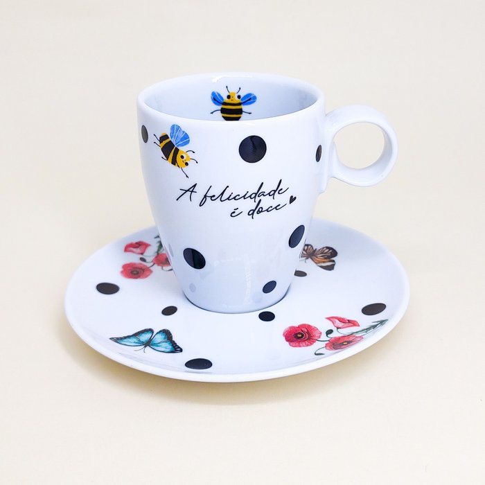 Xícara com Pires Coleção Borboletas - Adoce Sua Vida Branco com estampa
